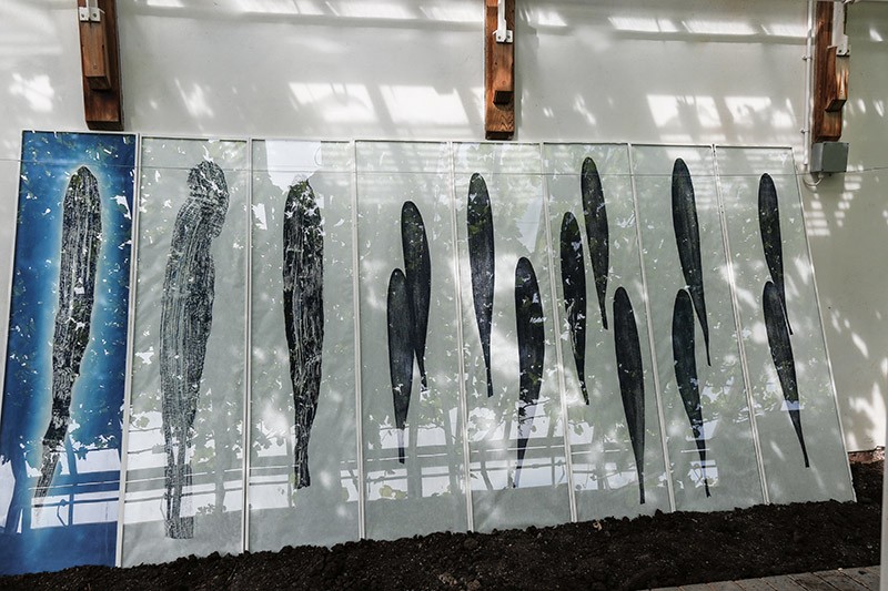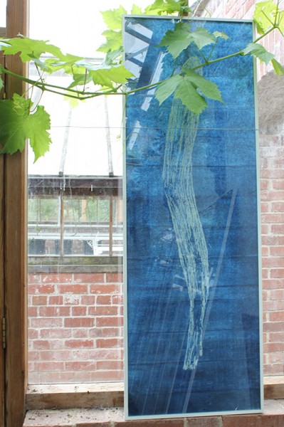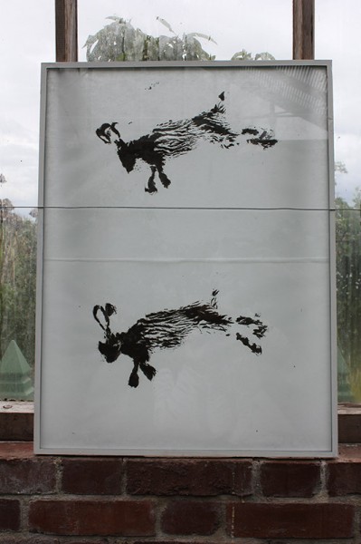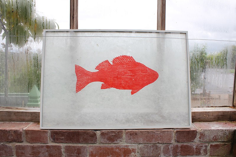 Fish, birds, animals and insects, their relationship to their environment and to us is my main subject matter. These things are my satellites and for me require serious consideration. I transfer images directly from objects that are found in the landscape in which I work – deer, geese, fish, voles, shrews, etc. I hand burnish to transfer prints from wood onto paper, inking to avoid filling in the wood grain. I use blue, which is naturally transparent, on unsized Japanese paper or thin textile.